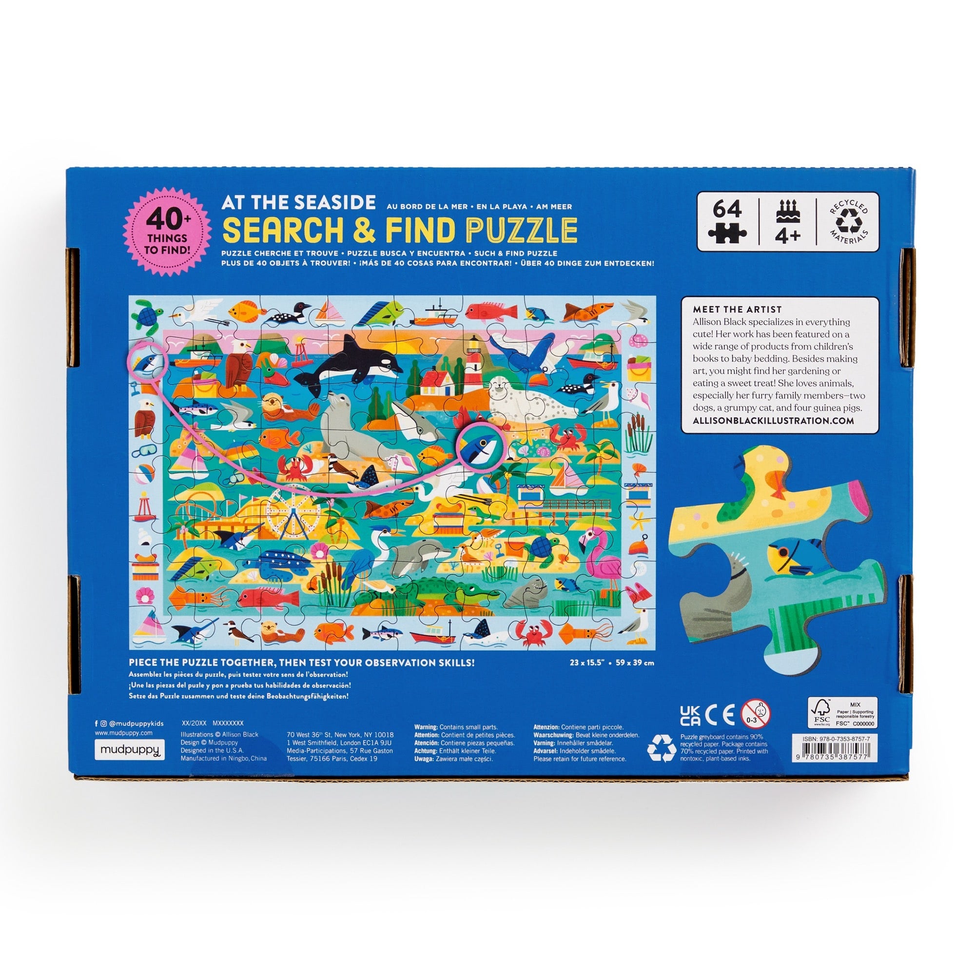 Dive into a world of seaside fun with this charming 64-piece search and find puzzle by Allison Black. Perfect for curious minds, this puzzle combines the joy of traditional jigsaw puzzles with an interactive hunt for hidden objects throughout the vibrant beach scene. Watch as little explorers piece together the colorful illustration while spotting all the sneaky surprises tucked into every corner. Ideal for developing observation skills and keeping kids entertained for hours of screen-free play.