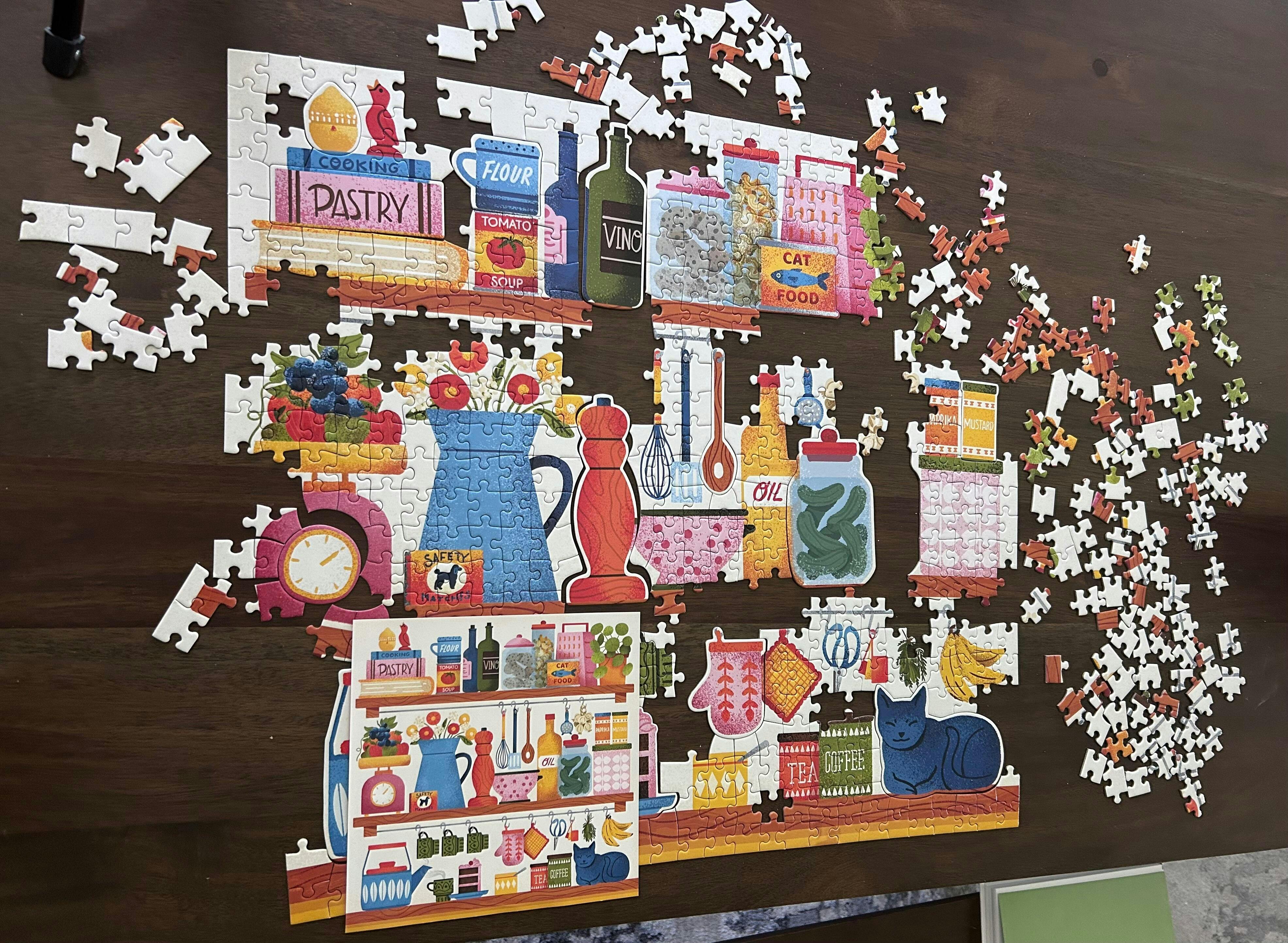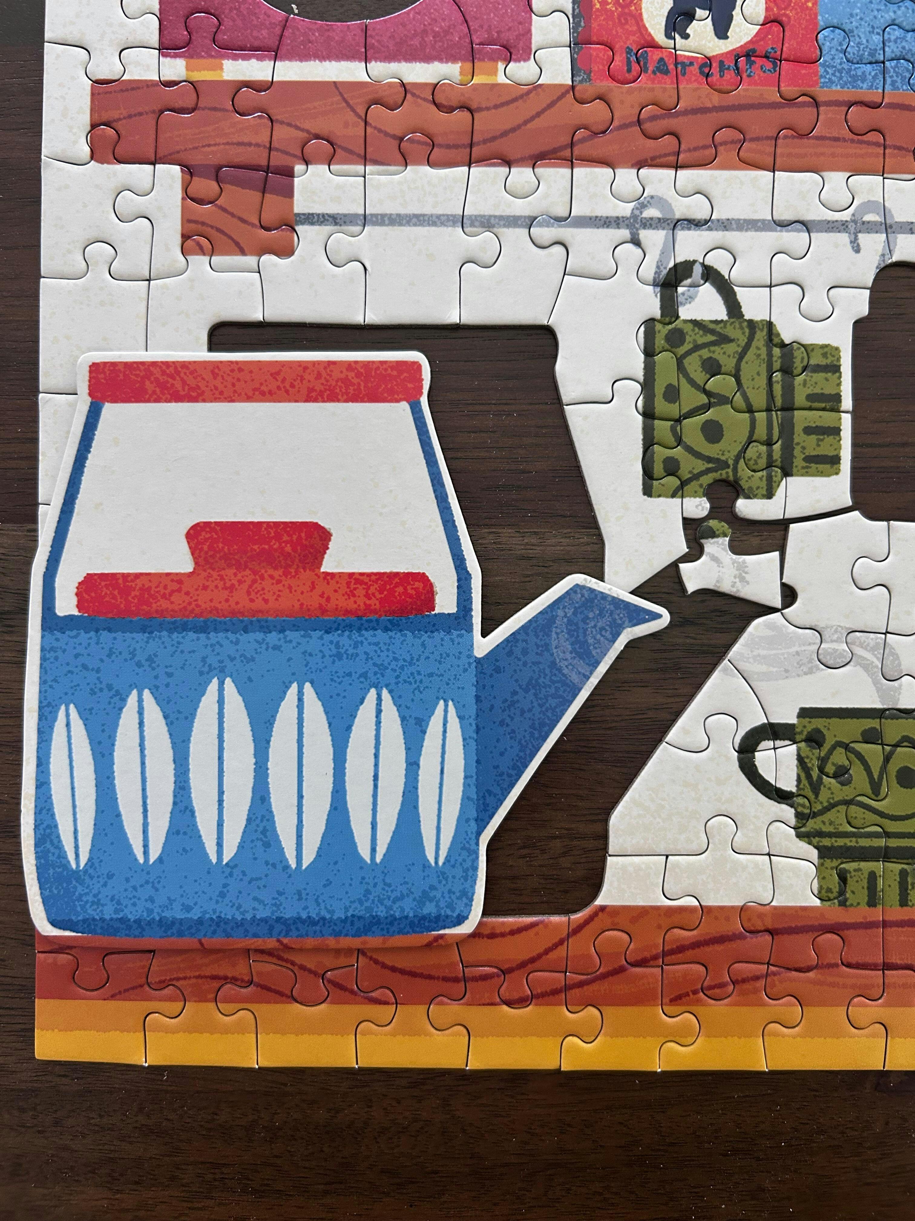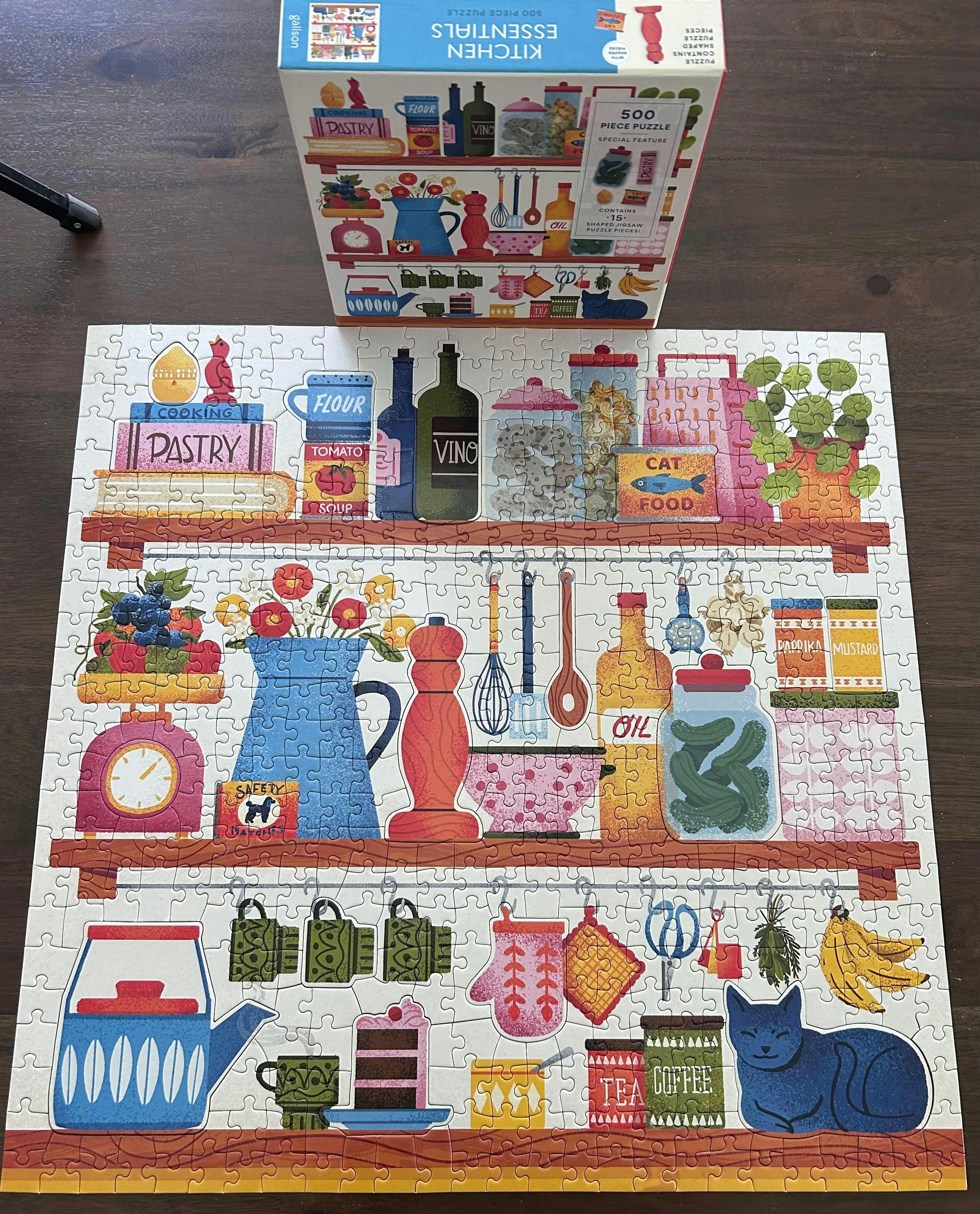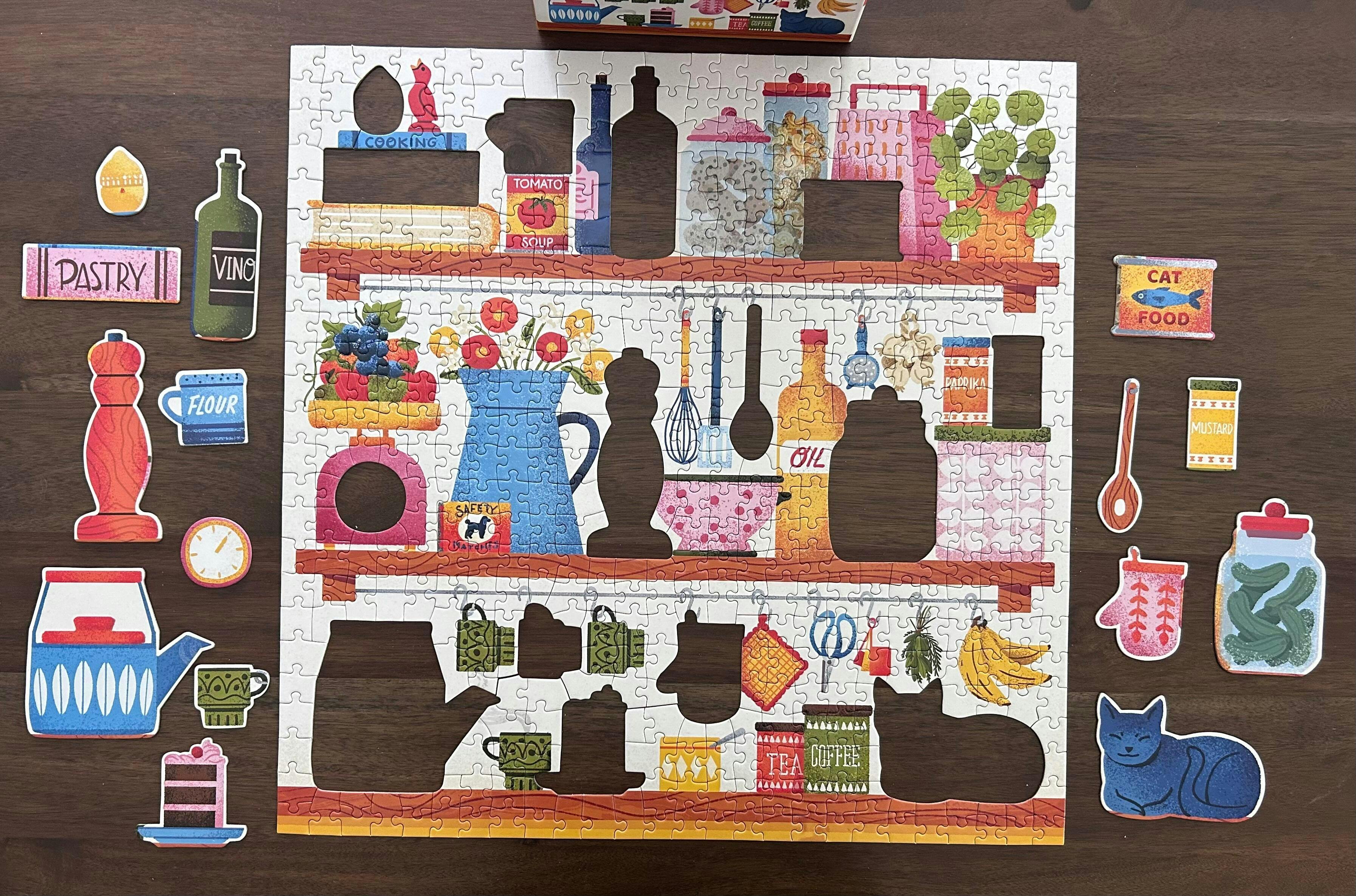 Kitchen Essentials 500 Piece Puzzle with Shaped Pieces from Galison features a brightly illustrated kitchen shelfie and includes 15 fun shaped pieces that nestle neatly within the puzzle. Galison puzzles are packaged in matte-finish sturdy boxes, perfect for gifting, reuse, and storage.